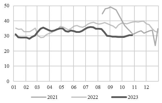 截至10月26日,终端织造成品(长纤布)库存平均水平为30.51天。随着部分订单的交付,少数工厂内坯布库存压力些许缓解,但多数织造工厂坯布库存压力仍在高位,当前工厂内订单依然以当季保暖面料为主,且多为内贸单,后续新单承接动力不足,坯布库存存在再次上行预期。终端织造企业原料(涤丝)库存平均水平为16.93天,上游原料涤丝厂商大幅让利出货,织造厂商逢低补入,些许提振原料备货周期天数。短期来看,部分客户仍存刚需备货需求,届时原料库存天数将以窄幅波动为主。近期,织造厂商手中订单为刚需内贸应季保暖防寒面料为主,交付周期多在11月初或中旬附近。外贸方面仅少量刚需订单以及明年春季订单为主,考虑到后续单量可持续性有限,如若“双11”订单未超预期成交,则仍存下滑预期。
