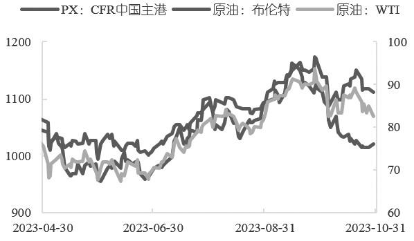 从成本端来看,受巴以冲突影响,原油高位振荡,支撑尚可,但PX方面调油逻辑切换,调油效益的回落使得芳烃调油料价格下跌,PX和原油走势分化,价格较弱。歧化装置效益修复之下,甲苯、二甲苯用于化工生产积极性提升,但PX当前由于PTA开工率、产量均有下降,需求走弱,成本端难以拉动PX价格上涨,PX自身供应有所压缩,但后期PX负荷或有提升。目前PXN仍呈现压缩态势,PX估值相对合理。当前来看,PTA与PX走势较为一致,PTA表现稍强于PX。不过从后期供需来看,如果没有出现较多的PTA装置意外检修,PX的累库幅度较为有限,PXN探底幅度或放缓。