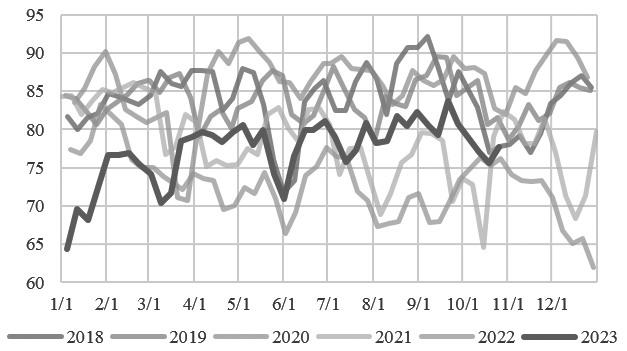 图为PTA国产开工率(单位:%)