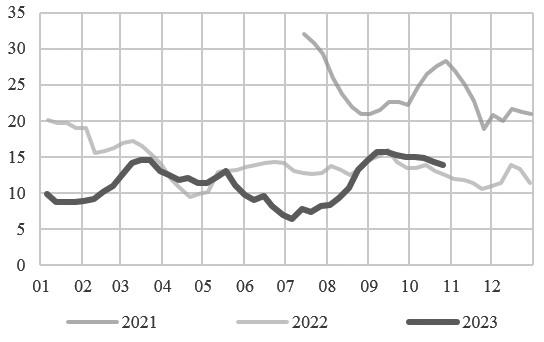 冷冬将至,叠加“双11”热度,截至本周,绒类保暖面料走货尚可,且部分家纺订单窄幅回暖,周内个别天出现产销放量,轻纺城成交量小幅上行,提振市场情绪。但目前来看,终端纺织企业整体新单到位不足,市场信心疲弱,周内聚酯市场亦多呈现跌势,其中长丝、工业丝跌幅较大,瓶片在自身减产扩大下跌幅小于长丝,短纤由于主流生产企业库存持续偏低影响价格相对抗跌。聚酯总体库存有所回升,其中长丝累库最为明显,但还是明显少于去年。目前聚酯开工率有所下滑,织造业开工率维持在80%左右,处于年内高点。虽然短期内消费市场热度尚存,但中长期来看,产业仍然对未来消费持较为悲观的态度。