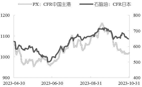 图为PX与石脑油价格走势(单位:元/吨)
