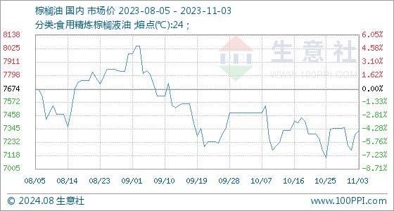 11月3日生意社棕榈油基准价为7292.00元/吨