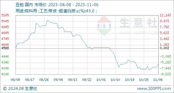 11月6日,生意社豆粕基准价为4270.00元/吨,与本月初(4230.00元/吨)相比,上涨了0.95%。