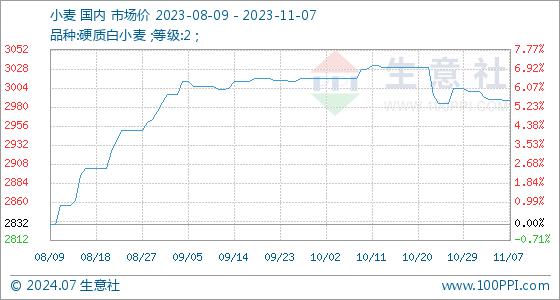 11月7日,生意社小麦基准价为2988.00元/吨,与本月初(3000.00元/吨)相比,下降了-0.40%。