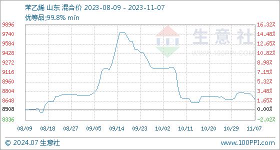 11月7日,生意社苯乙烯基准价为8733.33元/吨,与本月初(8775.00元/吨)相比,下降了-0.47%。