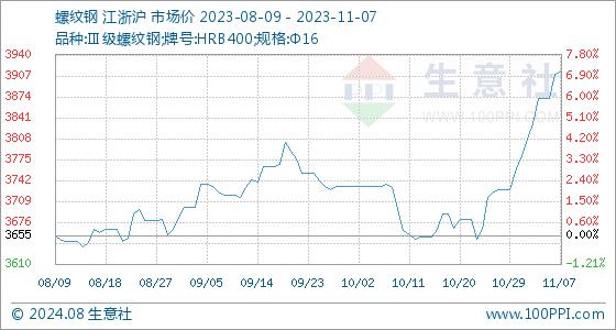 11月7日生意社螺纹钢基准价为3909.56元/吨