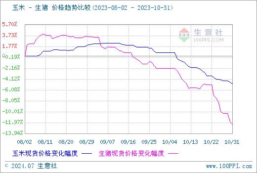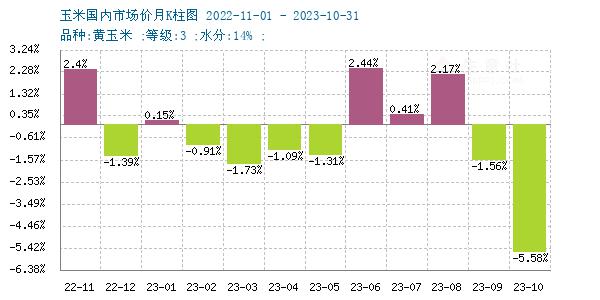 据生意社商品行情分析系统,10月国内玉米价格整体持续震荡下行,10月1日3等黄玉米均价为2788.57元/吨,10月31日均价为2632.86元/吨,月内下跌5.58%。