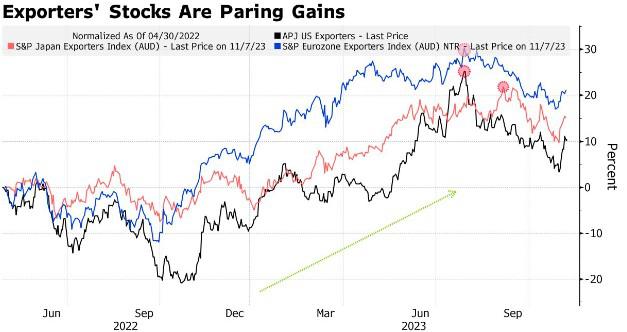 彭博美元指数正走向7月份以来最糟糕的一个月,此前美联储暗示,其长达近两年的紧缩周期可能即将结束,这促使交易员加大了对明年降息的押注。日本和欧洲出口商指数,以及许多亚洲同行的指数,在今年头8个月反弹后,已从近期高点回落。