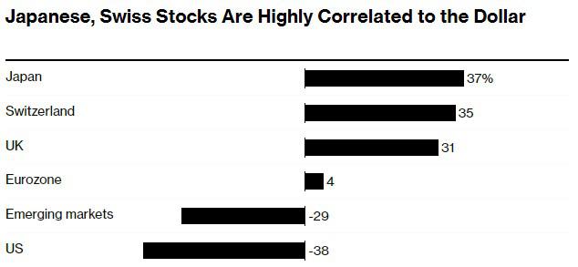 包括Mislav Matejka和Prabhav Bhadani在内的摩根大通股票策略师在上月底的一份报告中写道,自2010年以来,日本股市与美元的相关性相对较高,为37%;瑞士紧随其后,为35%,英国为31%。相比之下,新兴市场与美元的相关性为- 29%。