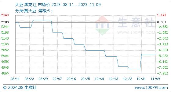11月9日,生意社大豆基准价为5020.00元/吨,与本月初持平。