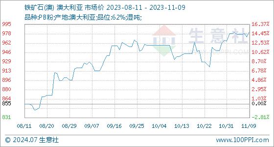 11月9日,生意社铁矿石(澳)基准价为973.22元/吨,与本月初(966.11元/吨)相比,上涨了0.74%。