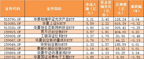数据显示,在11月8日的非货币ETF市场中,华泰柏瑞中证光伏产业ETF的基金份额增加了3.43亿份,净流入额为3.21亿元。华夏上证50ETF的基金份额增加了2.22亿份,净流入额为5.59亿元。华夏恒生互联网科技业ETF的基金份额增加了2亿份,净流入额为0.8亿元。
