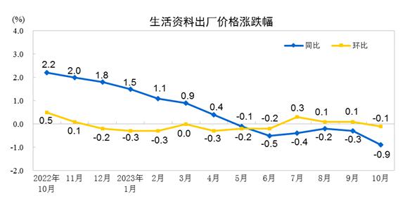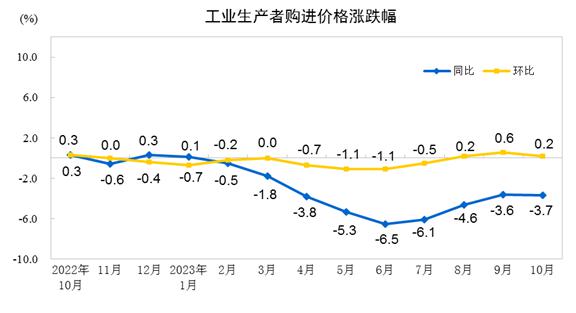 2023年10月份,全国工业生产者出厂价格同比下降2.6%,环比持平;工业生产者购进价格同比下降3.7%,环比上涨0.2%。1―10月平均,工业生产者出厂价格比上年同期下降3.1%,工业生产者购进价格下降3.6%。