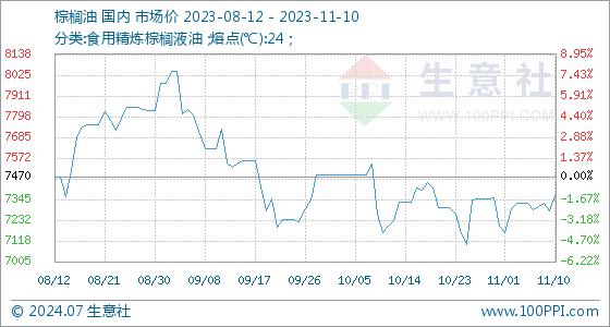 11月10日生意社棕榈油基准价为7280.00元/吨