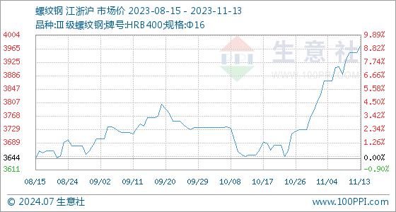 11月13日生意社螺纹钢基准价为3952.89元/吨