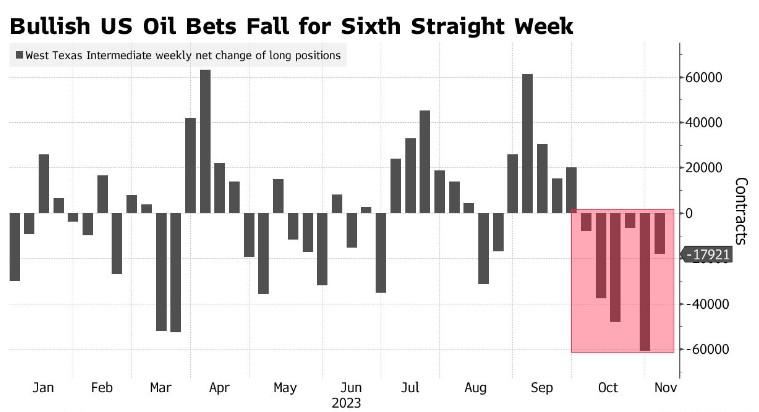 智通财经获悉,过去一个月,随着需求担忧情绪重返市场,基金经理对美国石油的看跌押注增加了逾两倍。根据商品期货交易委员会(CFTC)的数据,截至11月7日当周,空头头寸增加逾2万份合约,至95756份。现在空头数量达到了7月份以来的最高水平。与此同时,对冲基金连续第六周大幅削减对油价上涨的押注。