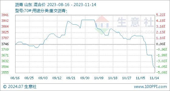 11月14日,生意社沥青基准价为3601.00元/吨,与本月初(3802.67元/吨)相比,下降了-5.30%。