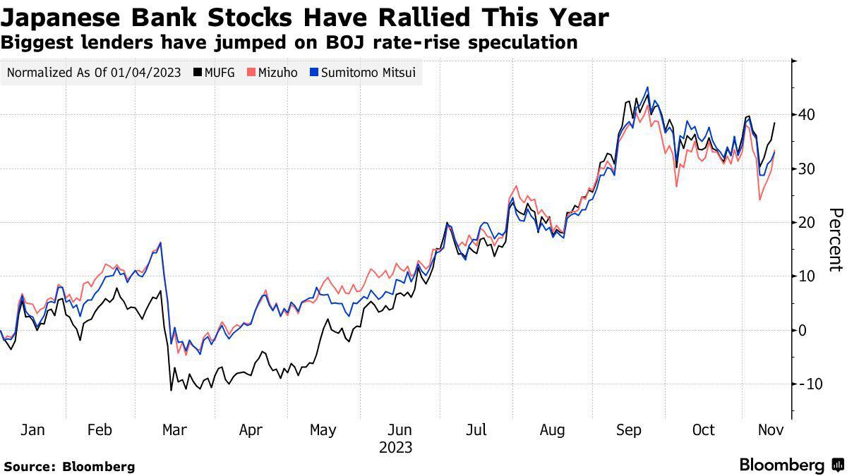 如果日本央行结束长达7年的负利率政策,日本金融机构在国内的盈利前景也将有所改善。负利率政策打压了银行等金融机构在贷款端的盈利能力。由于市场预期日本央行最早将在明年上半年采取这一举措,这些银行的股价今年大幅飙升。