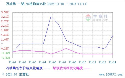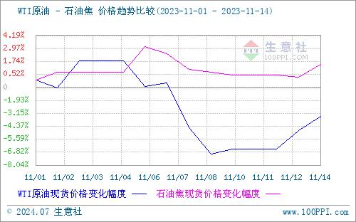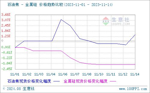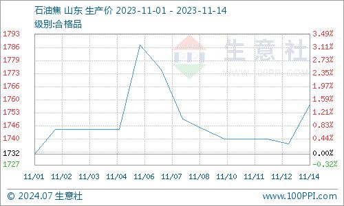 据生意社商品分析系统显示,截止到11月14日山东市场地炼石油焦价格为1757.50元/吨,较11月1日1732.50元/吨上涨1.44%。