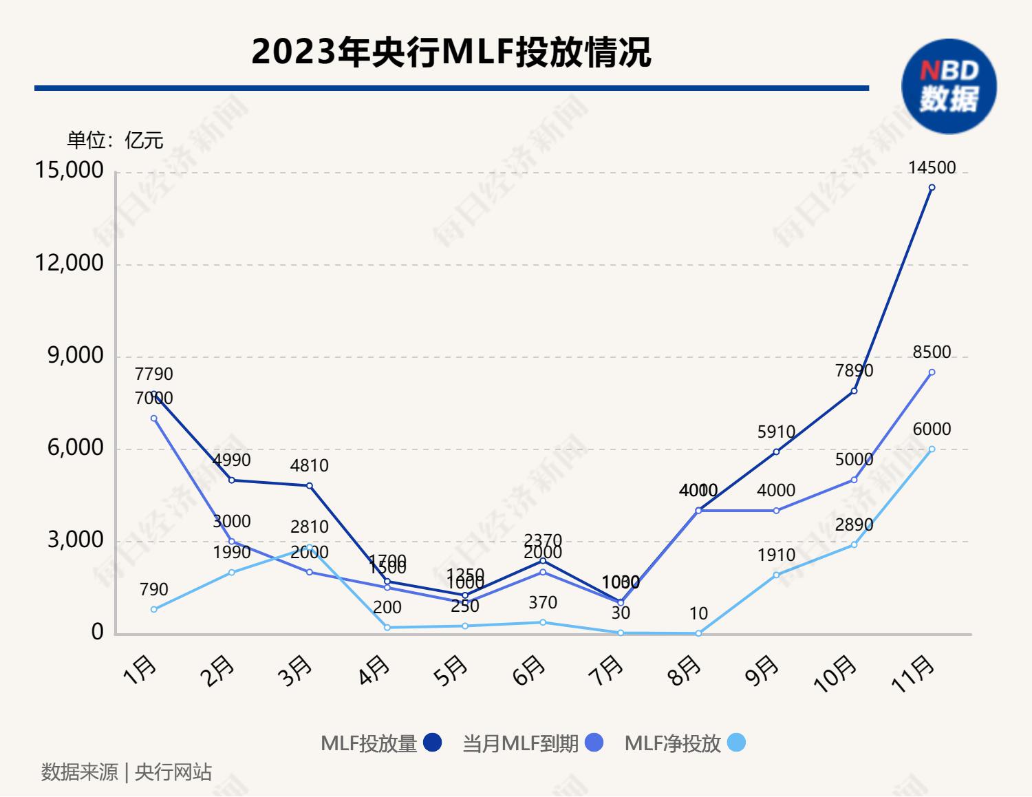 《每日经济新闻》记者注意到,截至目前央行已经连续1年超额续做MLF。而近几月净投放量明显扩大,今年8月至10月MLF净投放量分别为10亿元、1910亿元、2890亿元。11月净投放进一步扩大,本月央行MLF投放规模为14500亿元,到期8500亿元,实现净投放6000亿元。