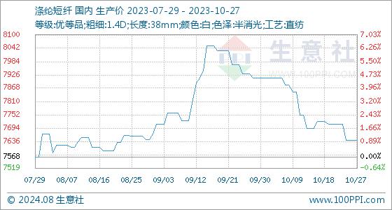 10月27日,生意社涤纶短纤基准价为7642.00元/吨,与本月初(7912.00元/吨)相比,下降了-3.41%。