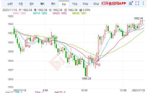 摘要周四(11月16日)本交易日现货黄金日内维持震荡走势,今日开盘报1959.59美元/盎司,最高触及1962.49美元/盎司,最低触及1956.29美元/盎司,截止发稿金价报1962.26美元/盎司,涨幅0.17%。