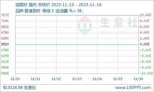 据生意社商品行情分析系统监测,11月10日国产菜籽市场均价为6520元/吨,11月16日国产菜籽市场均价为6520元/吨,期间报价持稳。近期国产菜籽价格持稳。下游市场以刚需采购为主,市场需求一般。冬菜籽货源逐渐减少,支撑国产菜籽行情。本周菜粕行情窄幅下滑调整,菜油行情小幅上涨。市场冬菜籽库存逐渐消耗,贸易商挺价意愿较强。预计国产菜籽或将持稳为主,变化不大。