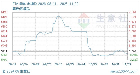 11月9日,生意社PTA基准价为5888.00元/吨,与本月初(5915.00元/吨)相比,下降了-0.46%。