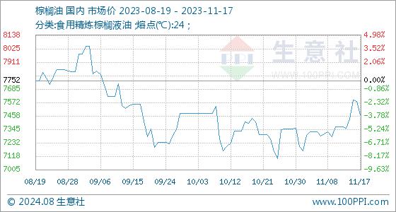 11月17日生意社棕榈油基准价为7580.00元/吨