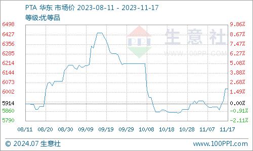 国内PTA现货市场行情走势上涨,截止周末华东市场均价6030元/吨,较周初价格5894元/吨上涨2.32%。近期PTA自身装置变化来看,重启与检修并存,总体负荷小幅下滑,目前行业开工率在74%附近。下游聚酯负荷维持在90%附近高位,江浙主流涤纶工厂报价有探涨情绪。订单方面,冬季订单随着天气转冷开始大批次启动,但目前织造端订单不一定有持续性,尤其是补单的结束,织造出货再次走弱压力依旧存在。纺织行业进入季节性淡季叠加部分终端产品库存偏高,加弹、织造、印染开机率局部下滑,其中江浙织机综合开机率在75%附近,下游行情小幅上涨,PX行情走势暂稳。