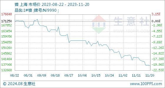 11月20日,生意社镍基准价为136733.33元/吨,与本月初(145433.33元/吨)相比,下降了-5.98%。