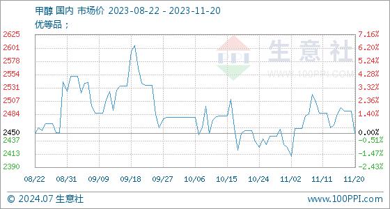 11月20日,生意社甲醇基准价为2490.00元/吨,与本月初(2430.83元/吨)相比,上涨了2.43%。