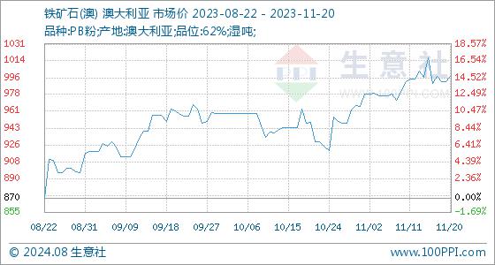 11月20日,生意社铁矿石(澳)基准价为992.78元/吨,与本月初(966.11元/吨)相比,上涨了2.76%。