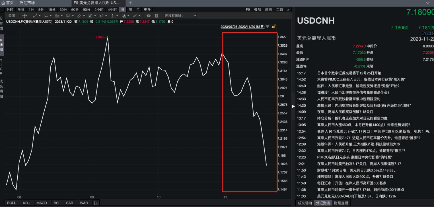 11月20日,在岸、离岸人民币对美元汇率出现强势拉升,截至记者发稿时,二者已双双收复“7.2”关口。数据显示,其中,在岸人民币对美元汇率盘中最高触及7.1700,日内大涨超600点;离岸人民币对美元汇率盘中最高触及7.1703,日内涨超300点。拉长时间看,11月份以来,在岸、离岸人民币对美元汇率分别上涨约1.91%、2.20%。