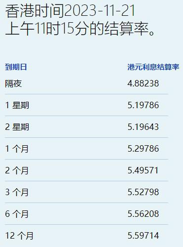 11月21日,随着年结效益开始显现,港元拆息连续三日全线上扬,其中,隔夜息升至4.88238%,再创逾一个月新高,而与楼按相关的一个月报5.29786%,续见9月29日以来最高,三个月期高见5.52798%,与同期美元LIBOR息差收窄至10基点。长息方面,六个月及一年期分别报5.56208%和5.59714%。