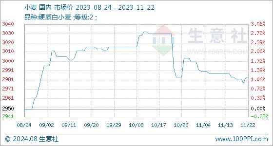 11月22日,生意社小麦基准价为2984.00元/吨,与本月初(3000.00元/吨)相比,下降了-0.53%。