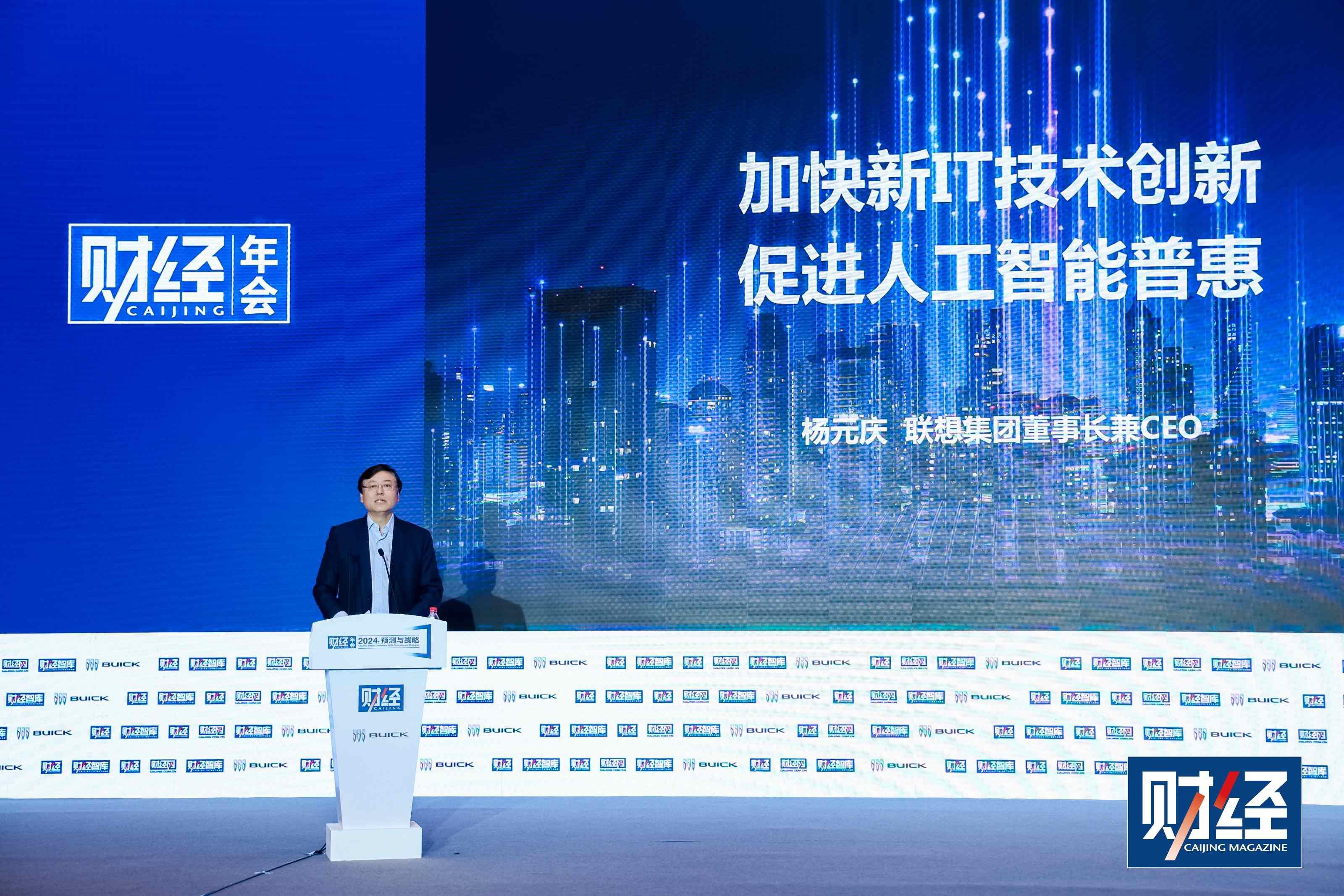 (联想集团董事长兼CEO杨元庆在《财经》年会2024发表“加快新IT技术创新、促进人工智能普惠”主题演讲)