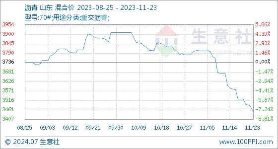 11月23日,生意社沥青基准价为3484.33元/吨,与本月初(3802.67元/吨)相比,下降了-8.37%。