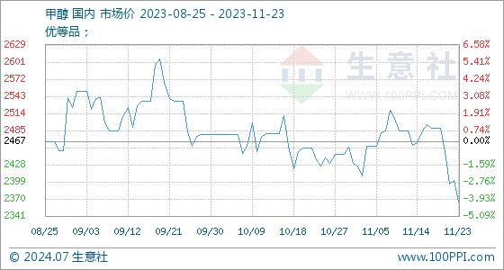 11月23日,生意社甲醇基准价为2401.67元/吨,与本月初(2430.83元/吨)相比,下降了-1.20%。