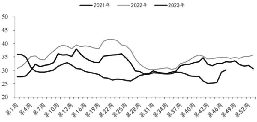 随着新季玉米不断上量以及丰产压制,玉米价格明显回落。而小麦因减产及年底消费旺季支撑,价格表现良好,小麦与玉米价差回升使小麦替代优势消失,玉米饲用需求回归。同时,当前生猪存栏整体偏高,且临近年底,市场为冬季腌腊而进行的育肥增多,玉米饲用需求增加,饲料企业玉米库存也于近期有所回升。根据我的钢铁网对全国18个省份47家规模饲料厂的最新调查数据,截至11月16日,饲料企业玉米平均库存为30.11天,周环比增加0.71天,增幅2.41%,较去年同期下跌13.57%,整体仍处于近三年来相对低位,短期刚需采购支撑良好。