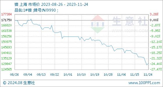 11月24日,生意社镍基准价为128966.67元/吨,与本月初(145433.33元/吨)相比,下降了-11.32%。