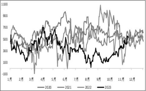 因气温下降,终端应季订单情况有所回暖,内销较好的同时外销部分订单跟进,织造开工继续提升。截至11月23日,江浙加弹和织机开机率分别为91%、85%,较上周增加2个百分点和3个百分点,处于历年高位。目前POY、DTY和FDY库存天数分别在15天、15天和25.5天左右,处于中性偏低水平。