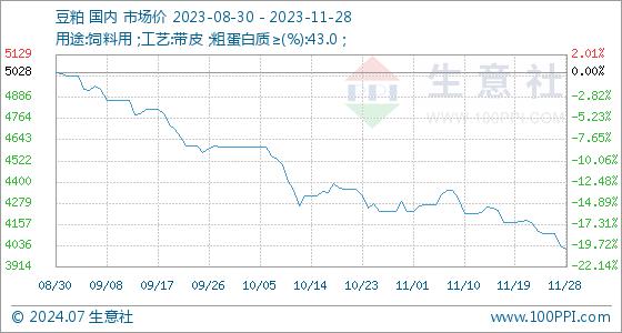 11月28日,生意社豆粕基准价为4032.00元/吨,与本月初(4230.00元/吨)相比,下降了-4.68%。