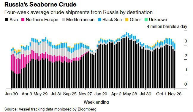 在截至11月26日的四周内,没有俄罗斯原油运往北欧国家或地中海国家。