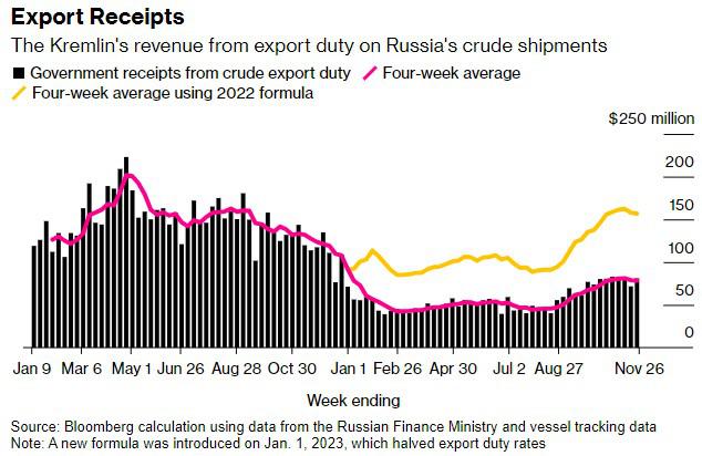 在截至11月26日的七天里,原油出口关税流入俄罗斯政府的资金回升至8100万美元,而四周的平均收入几乎没有变化,仍为7800万美元。每周的收入弥补了前一周损失的90%。