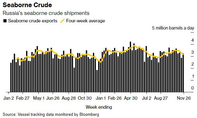 波动较小的四周平均流量连续第三周下降,因为10月份出口激增的最后一周从计算中剔除。按照这一标准,俄罗斯原油日发量降至316万桶,较截至11月19日的修正数据减少了约10万桶。这是12周以来的最低水平,但仍比截至8月20日期间的日产量高出约27万桶,当时俄罗斯的原油出口削减幅度最大。