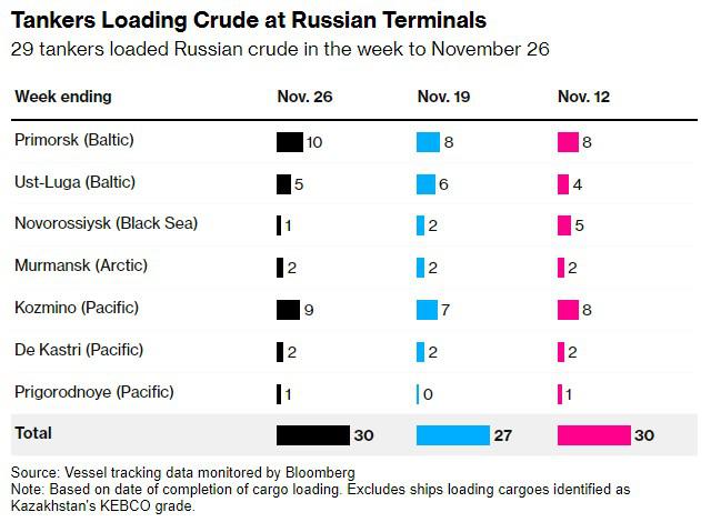 船舶跟踪数据和港口代理报告显示,截至11月26日的一周,总共有30艘油轮装载了2270万桶俄罗斯原油。这比上周修正后的数据增加了约260万桶。