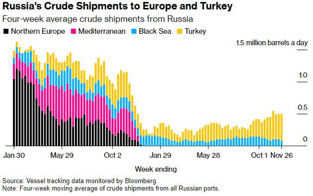 在截至11月26日的四周内,对土耳其的出口量增加到每天约42万桶。目前的价格仍是7月和8月的两倍多。