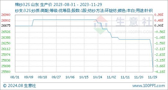 11月29日,生意社棉纱32S基准价为26175.00元/吨,与本月初(26525.00元/吨)相比,下降了-1.32%。