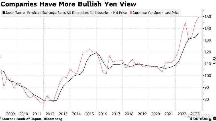 不过,企业对日元汇率的假设也有可能比外汇策略师的预测更接近现实。Bloomberg汇编的数据显示,外汇策略师预计,日元兑美元汇率在本季度剩余时间里将接近148日元兑1美元,到明年3月底将接近145日元兑1美元。